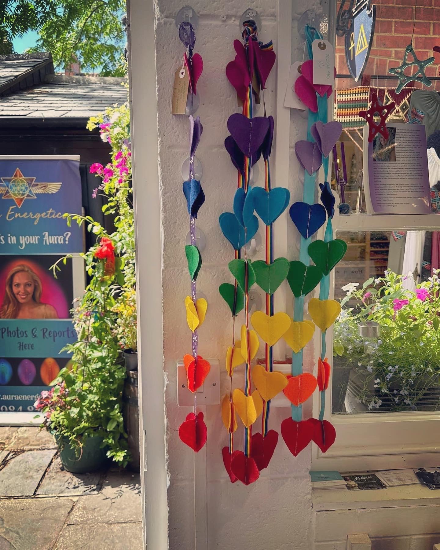 I researched the chakras, what they represented and what colours they were. (See previous post discussing this) I then thought it would be nice to offer love through my work because I like to show that I really treasure my customers and I want to manifest β¨loveβ¨in their lives and homes. The world needs more love and light in my opinion. So I started cutting several hearts from the felt and then arranged the coloured pieces on the strips of ribbon in the order of the chakras and whizzed them up on the sewing machine. I chose some rainbow coloured ribbon and some slightly wider lilac ribbon with dragonflies on. Both were significant to me because the chakra colours are included in a rainbow and it was also the time of year for many Pride celebrations π₯°ππ³οΈβππ
