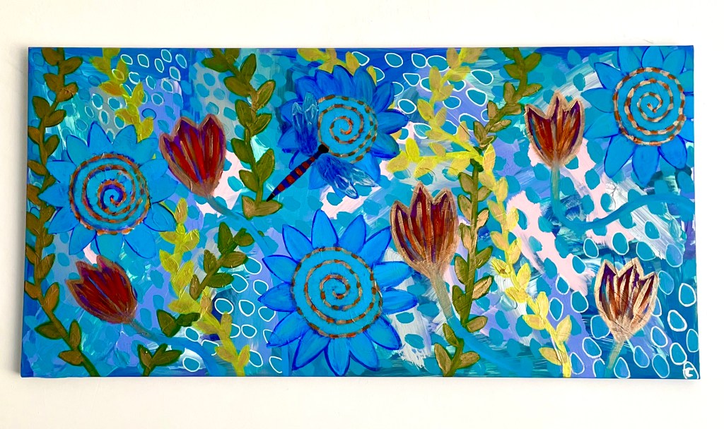The larger flowers and overall aesthetic were inspired by a memory of writing to my best friend when we were young and she was ill with leukaemia in hospital. I used to have a writing set i specifically used to write to her with, as she bought it for me for Christmas. This painting looks just like it. Once i realised this, i instantly felt like Claire was writing to me through my art. I’ve always had a psychic ability and received messages from loved ones for most of my life. I really enjoyed adding to this painting each time and to think she was right there beside me as i did it, fills me with gratitude for the work i do now.