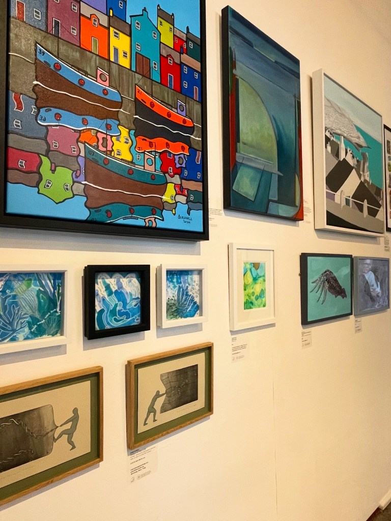 I think that the curation of the Member’s show was done very thoughtfully because the colours and textures were complimentary between all the works on each wall space. The subject matters were mostly coastal themed too which was nice. You may notice there was a continuity with the outlines and colours, the patterns, the size of the works and the frame choices.