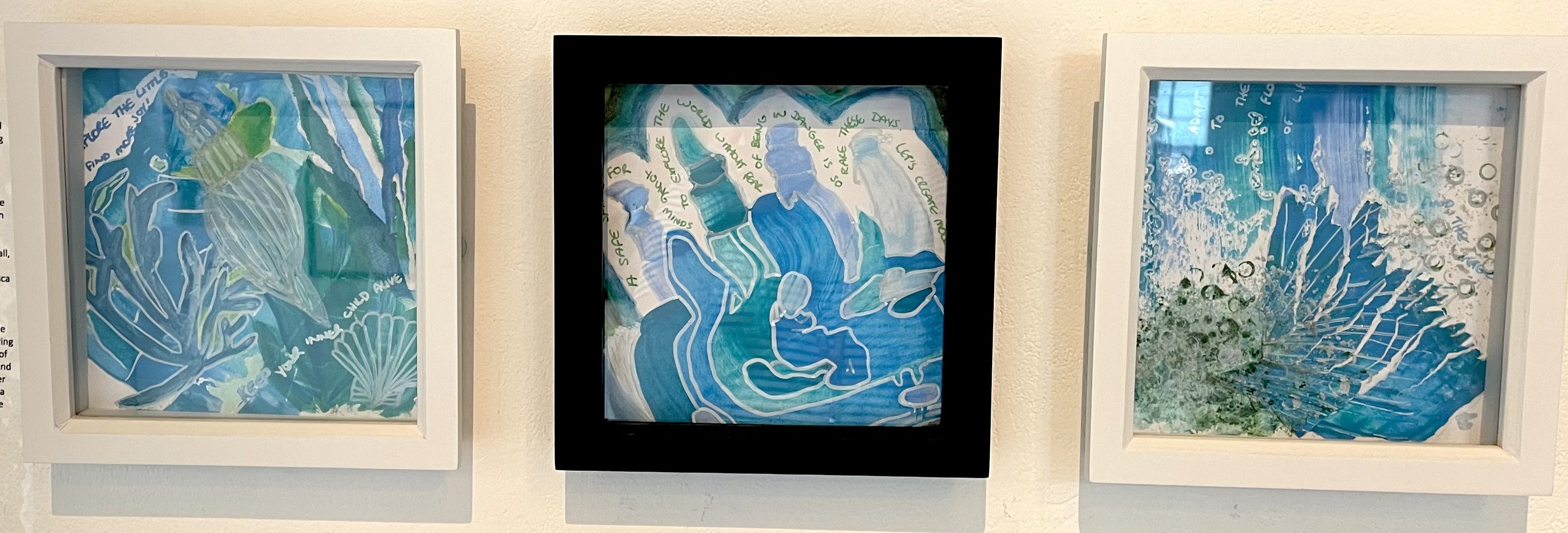 This set of 3 mixed media artworks have been in a recent exhibition at the Poly in Falmouth. They started as experimental pieces whereby i tested out different processes and went with the flow. I decided to make them with the mindset that nothing was a failure or wrong, even if it didn’t end up exactly how i expected. I let the work guide me through each step and found this a very liberating way to create. I would usually have this intuitive approach but with a bit of intention in it. The only intention i had for these 3 pieces was to use coastal blues and white. Here is a breakdown of what i did for each one and what meaning they took on at the end: