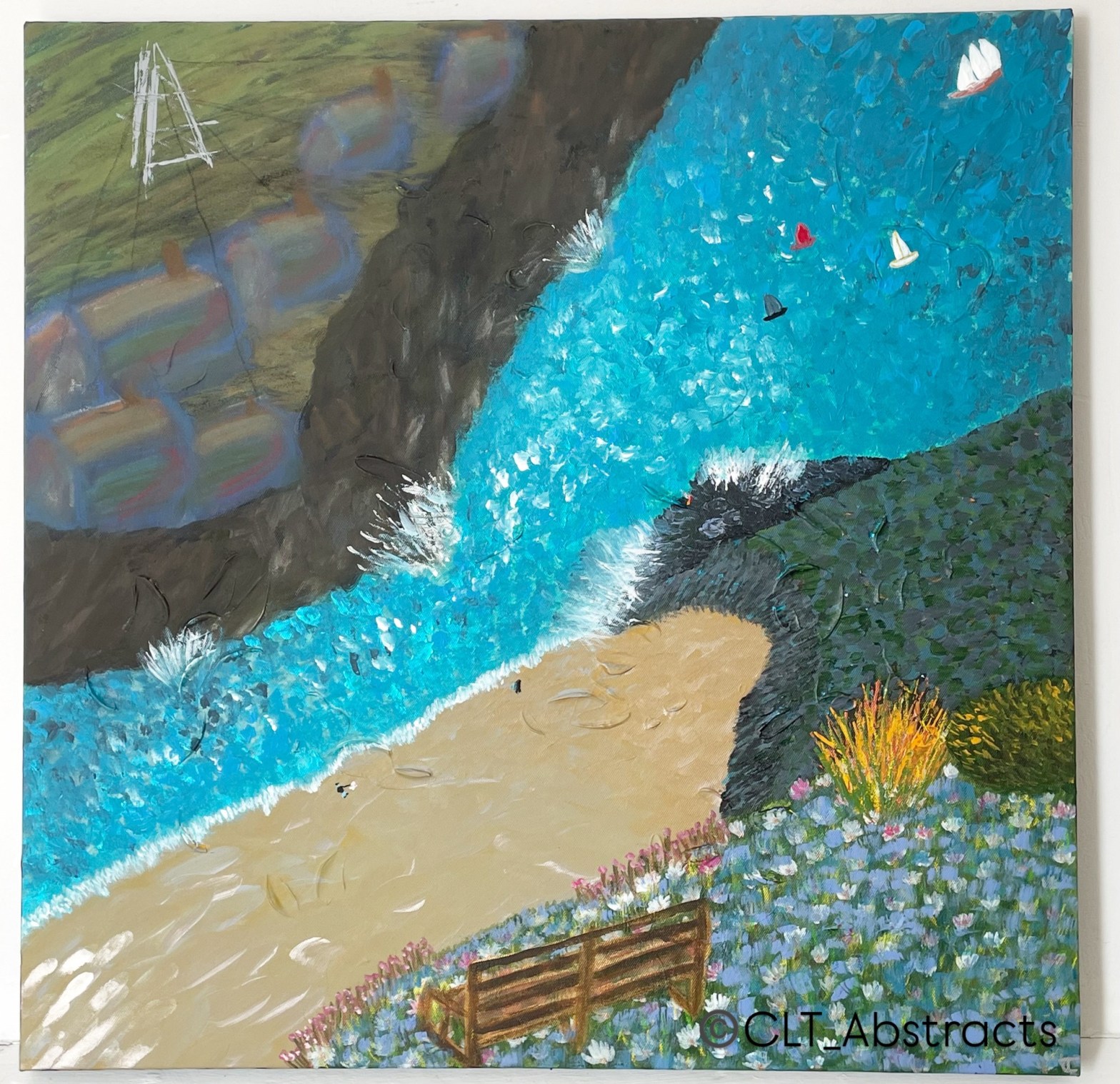 Mixed media on reclaimed canvas, 23.5″ x 23.5″ x 1″ / 60cm x 60cm x 2.5cm Here are few things to discover in my latest painting: 2. The electric wires seemingly conjoining the houses, forming an aspect of community but also appearing to hold the buildings back from the edge of the cliff. There isContinue reading “©️Daisies on the coast/Tethered (2025) by CLT_Abstracts”